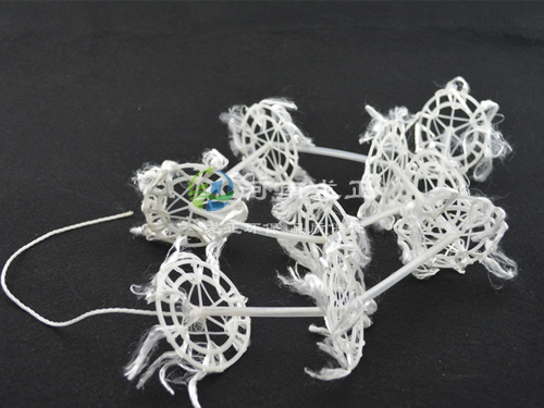【結構】是將塑料圓片壓扣改成雙圈大塑料環,將醛化纖維或滌綸絲壓在環的環圈上,使纖維束均勻分布;內圈是雪花狀塑料枝條,既能掛膜,又能有效切割氣泡,提高氧的轉移速率和利用率。使水氣生物膜得到充分交換,使水中的有機物得到高效處理。